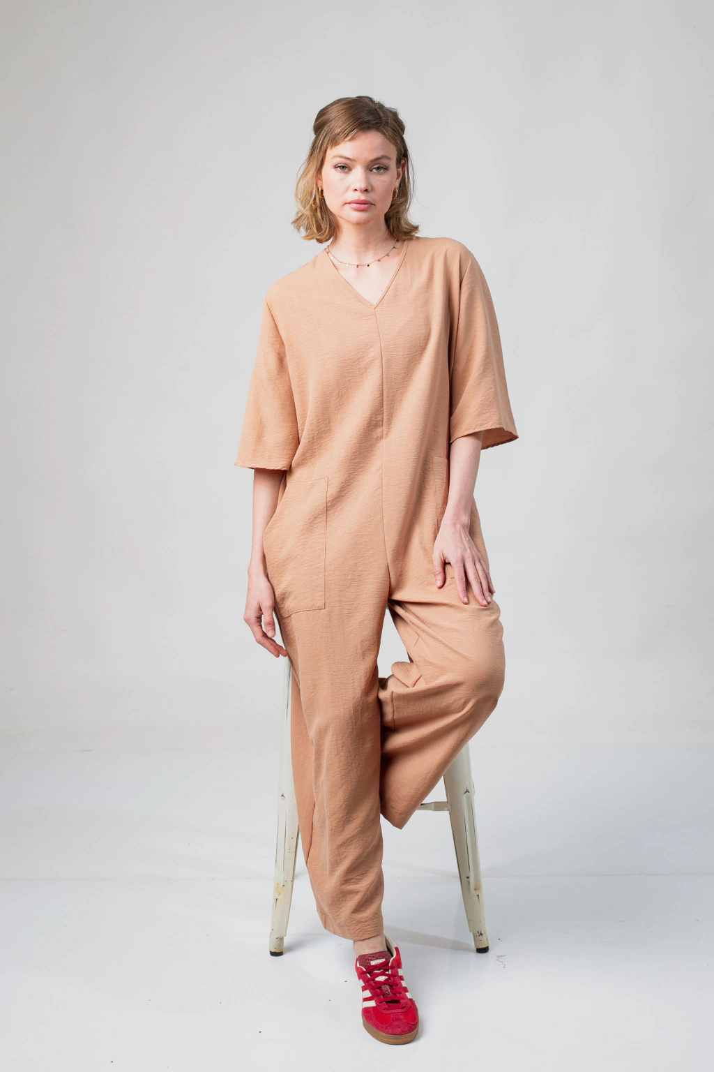 Descripción del Producto: Esta monoprenda es la combinación perfecta de comodidad y estilo. Con un corte suelto que favorece la libertad de movimiento y una silueta moderna, esta prenda es ideal para el uso diario o para ocasiones casuales. El escote en V agrega un toque de feminidad, mientras que las mangas 3/4 rectangulares ofrecen un aspecto contemporáneo y versátil. La espalda con cierre proporciona un ajuste seguro y cómodo, mientras que los dos precintos en la cintura permiten ajustar la prenda según la preferencia de cada persona. Además, cuenta con bolsillos frontales plaque y dos bolsillos en la cola para un toque funcional y práctico.